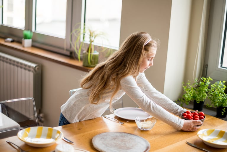 Setting the table involves lifting, carrying, and placing items, which help develop arm strength and coordination.